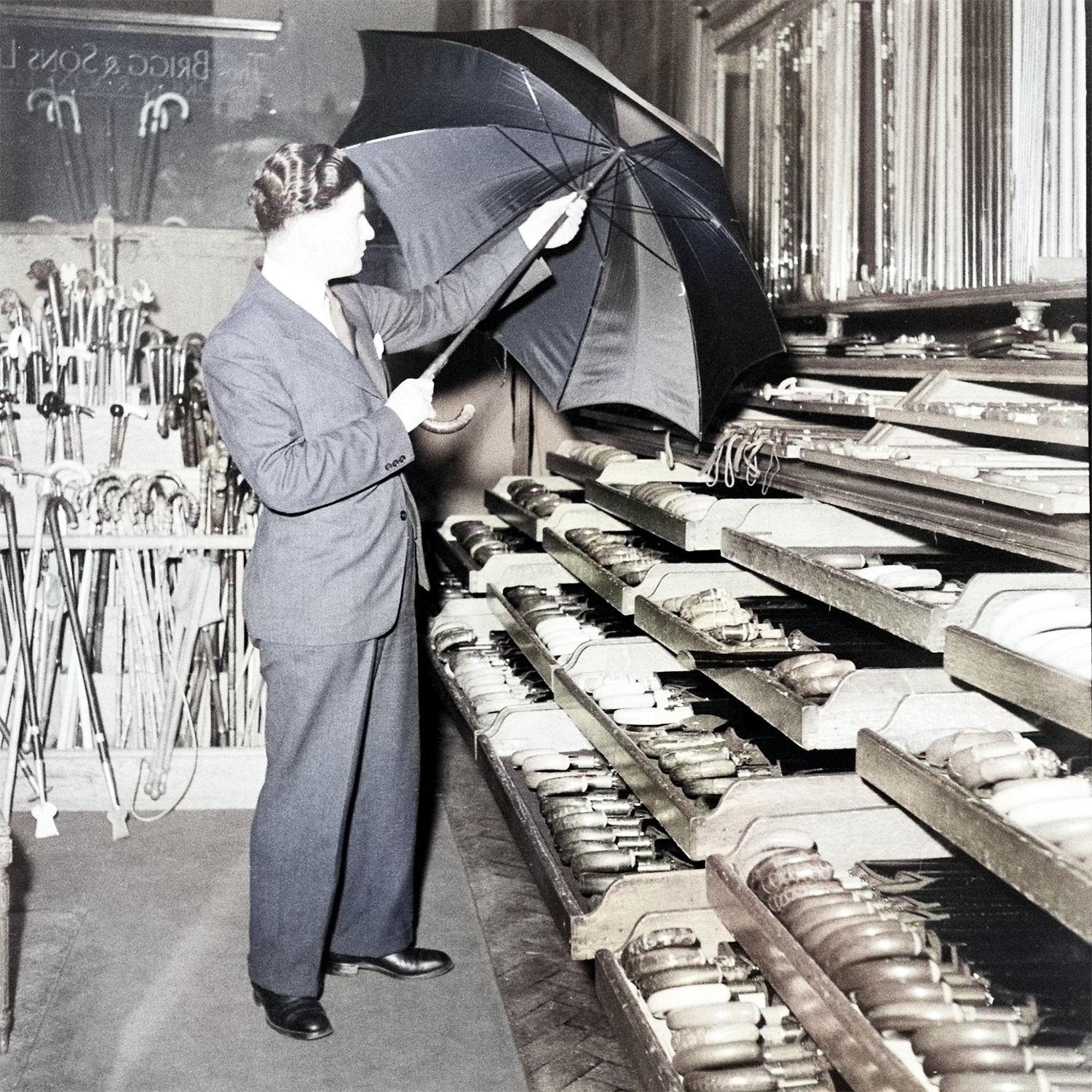The decline in walking sticks' popularity, partly due to the emergence of motoring as a leisure pursuit and the stick's role as a mobility aid for war casualties, was countered by the rise of umbrellas as a gentleman's accessory in 1930s London. To celebrate their centenary, Brigg introduced the ultra-slim "Centenary" umbrella, reflecting their ongoing efforts to design sleeker gadgets.